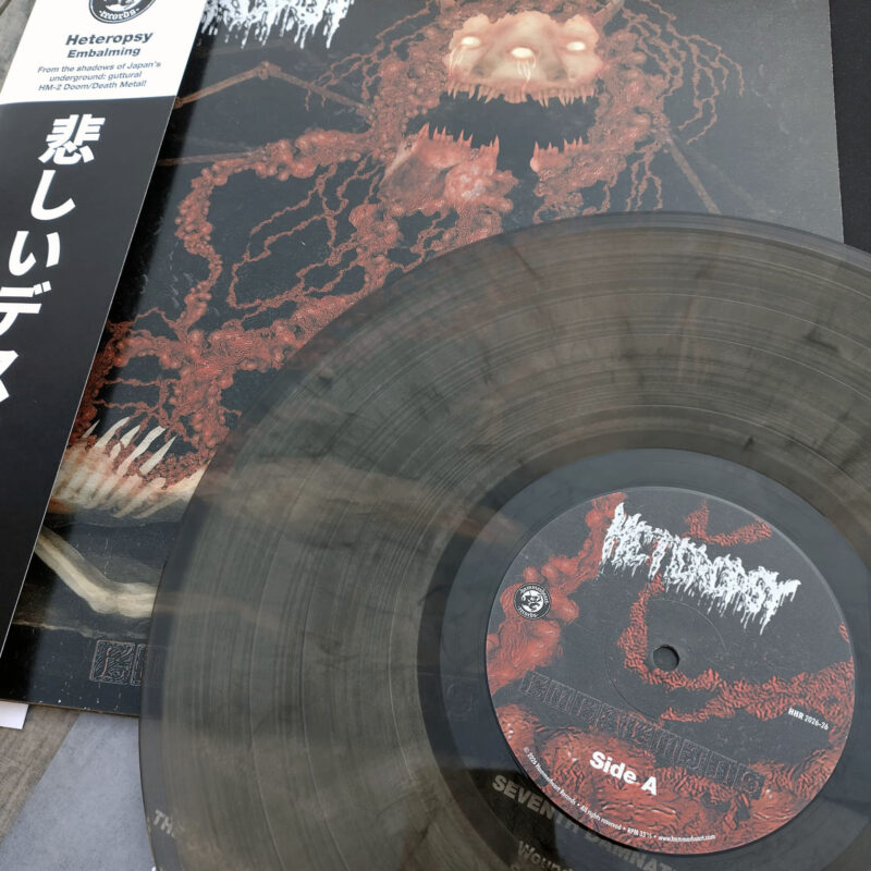 From the shadows of Japan’s underground: guttural HM-2 Doom/Death Metal! Heteropsy’s “Embalming” is out today on vinyl. Comes in a 3 mm sleeve on black smoke marble with a cool old school obi! For fans of: Autopsy, Dismember, Anatomia, Hooded Menace and Worm.