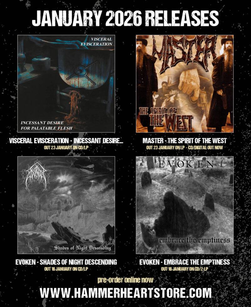 We proudly presents you the pre-orders all our january 2026 releases! Four killer re-issues from Visceral Evisceration (remastered, first time on vinyl), Master’s “The Spirit of the West” (remastered, available again on vinyl) and the first two Evoken albums “Shades of Night Descending” and “Embrace the Emtpiness”… also both remastered and with original artwork.